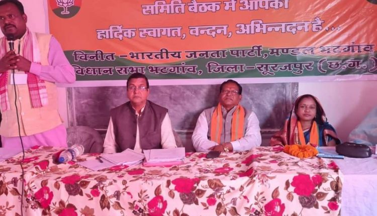 सुरजपुर-मोहिबुल हसन….भाजपा मंडल भटगांव के बुंदिया चंद्रमनी विद्या भवन में मंडल के सभी भाजपा मोर्चा प्रकोष्ठ के कार्यसमिति की बैठक रविवार को किया गया। बैठक में बतौर मुख्य अतिथि भाजपा पूर्व प्रदेशाध्यक्ष व पूर्व गृहमंत्री रामसेवक पैकरा, भाजपा जिलाध्यक्ष बाबूलाल अग्रवाल सहित प्रदेश मंत्री परमेश्वरी राजवाड़े, अजजा मोर्चा प्रदेश महामंत्री सतनारायण सिंह, अशोक सिंह, लक्ष्मी राजवाड़े व कार्यक्रम की अध्यक्षता मंडल अध्यक्ष सुभाष राजवाड़े के द्वारा की गई। भाजपा संस्थापक डॉ. श्यामा प्रसाद मुखर्जी एवं पंडित दीनदयाल उपाध्याय के तैलीय चित्र पर पुष्पांजलि अर्पित कर वंदे मातरम गान के साथ कार्यक्रम की शुरुआत की गई। मंच संचालन महामंत्री रमेश गुप्ता ने किया। कार्यसमिती की बैठक में बूथ स्तर तक संगठन की मजबूती पर चर्चा हुई। इसे लेकर बूथ स्तर के कार्यकर्ताओं को प्रशिक्षण दिया गया।