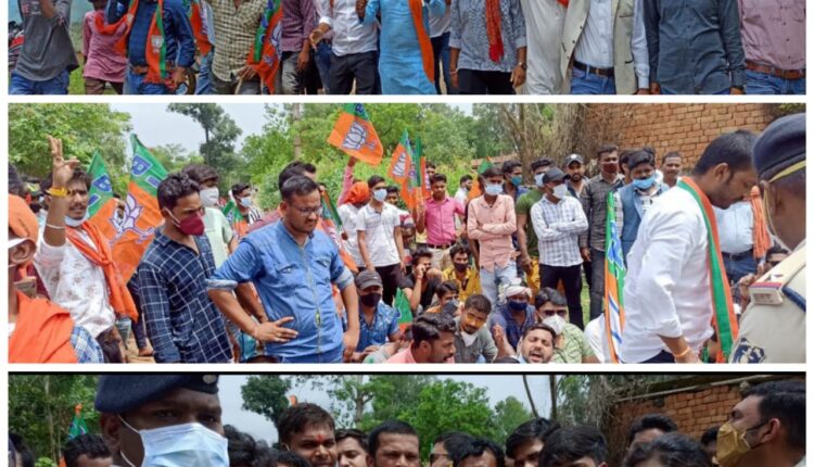 मोहिबुल हसन / भारतीय जनता युवा मोर्चा प्रदेश संगठन के आह्वान पर भाजयुमो सूरजपुर जिलाध्यक्ष रविंद्र भारती के नेतृत्व में प्रदेश सरकार के ढाई साल पूरे होने पर हिसाब मांगने भटगांव विधानसभा अंतर्गत 6 मंडल के सैकड़ों भाजयुमो कार्यकर्ता भटगांव विधानसभा विधायक एवं संसदीय सचिव पारसनाथ राजवाड़े के बतरा निवास पर पहुचे। वहाँ कार्यकर्ताओ के द्वारा सरकार के खिलाफ जमकर नारेबाजी की गई। यह बता दे कि पुलिस के द्वारा विधायक निवास को बेरिकेटिंग किया गया था, कार्यकर्ताओ ने जब आगे जाना चाहा तो पुलिस ने रोकी, जिससे पुलिस के साथ जमकर झूमा-झपटी हुई। अंतः कार्यकर्ता सड़क पर बैठ नारेबाजी कर वहाँ उपस्थित नायब तहसीलदार को मुख्यमंत्री के नाम ज्ञापन सौपा। इस दौरान पुलिस-प्रशासन मुस्तैद रही और जब कार्यकर्ता विधायक निवास से वापस चले गए तब कहीं जाकर पुलिस बल ने राहत की सांस ली।