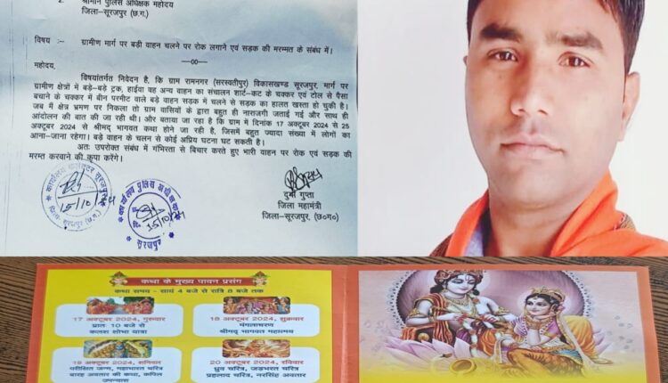 सूरजपुर/रामनगर/IRN.24… ग्रामीण मार्गं रामनगर, सरस्वतीपुर-सूरजपुर मार्ग में भारी वाहनों पर रोक लगाने व सड़क की मरम्मत कराने भाजयुमो जिला महामंत्री दुर्गा गुप्ता ने कलेक्टर एवं पुलिस अधीक्षक को ज्ञापन सौंपा और सरस्वतीपुर ग्राम की समस्या से औगत कराते हुए बताया कि बड़े वाहन शार्टकट व टोल से पैसा बचाने के चक्कर में बीना परमीट वाले बड़े वाहन ग्रामीण क्षेत्रों की सड़क में चलने लगे हैं जिससे सड़क की खस्ताहाल हो गया है लोगों को परेशानी हो रही है जब मैं क्षेत्र के भ्रमण में था लोगो के द्वारा बहुत ही नाराजगी जताई जा रही थी भारी वाहन चलाने पर रोक लगाने की बात कही जा रही है भविष्य में आंदोलन की बात भी कह रहे थे।।और बताया कि 17अक्टूबर से 25अक्टूबर तक श्रीमद भागवत कथा चालू होने जा रहा है जिसमें लोगों की भीड़ होगी सड़कों में भी आना जाना लगा रहेगा जिससे भारी वाहनों से कोई अप्रिय घटना घट सकती है।। अतः भारी वाहनों को चलने से रोक लगाने वह सड़क की मरम्मत कराने की आग्रह किया गया है।।