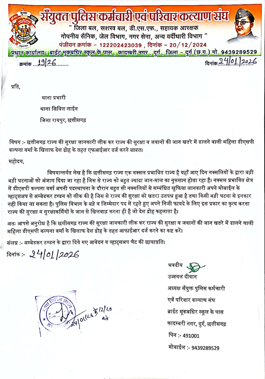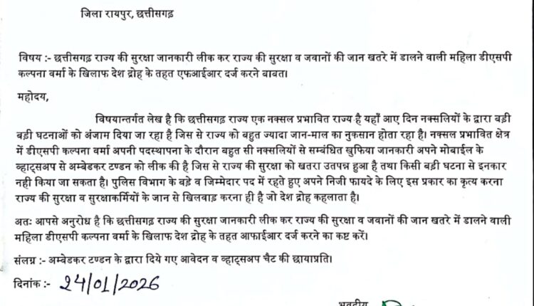 रायपुर/irn.24… संयुक्त पुलिस कर्मचारी एवं परिवार कल्याण संघ के अध्यक्ष उज्जवल दीवान ने सिविल लाइन थाने में दी लिखित शिकायतमहिला DSP कल्पना वर्मा के खिलाफ देशद्रोह समेत गंभीर धाराओं में FIR दर्ज किए जाने की मांग गहराते जा रही है।