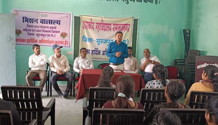 सूरजपुर/IRN.24… कलेक्टर रोहित व्यास के निर्देशन एवं मुख्य कार्यपालन अधिकारी जिला पंचायत के मार्गदर्शन में जिले में सड़क एवं सड़क जैसी परिस्थितियों में निवासरत बच्चों एवं मादक पदार्थाे का सेवन करने वाले बच्चों की पहचान हेतु सर्वेक्षण, रेस्क्यू एवं पुनर्वास हेतु विशेष सघन अभियान दिनांक 15 जुलाई से 14 अगस्त तक कार्ययोजनानुसार संचालित किया जा रहा है। इस योजना के तहत छ0ग0शासन की बाल सक्षम नीति अंतर्गत सर्वेक्षण कार्य करते हुए जिला बाल संरक्षण अधिकारी के नेतृत्व में मिशन वात्सल्य के तहत जिले के विकासखण्ड मुख्यालयों के शासकीय महाविद्यालय में बालक एवं बालिकाओं को बाल अधिकार एवं संरक्षण के प्रति जागरूकता लाने के उद्देश्य से जागरूकता कार्यक्रम आयोजित किये जा रहे है।
