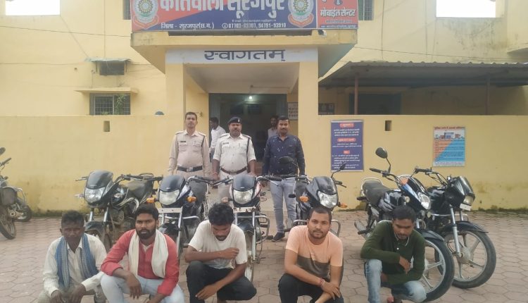 सूरजपुर। पुलिस अधीक्षक श्री रामकृष्ण साहू के निर्देश पर कोतवाली पुलिस मोटर सायकल चोरों की धरपकड़ एवं चोरी की मोटर सायकल बरामदगी में लगी हुई है। इसी क्रम में दिनांक 14 जुलाई को मोटर सायकल चोरी मामले में थाना सूरजपुर पुलिस ने आरोपी आशीष गुप्ता को पकड़ा था जिससे 2 चोरी की मोटर सायकल बरामद करते हुए न्यायिक रिमाण्ड पर भेजा गया था। आरोपी के द्वारा कई और मोटर सायकल चोरी करने के संदेह पर माननीय न्यायालय से पुलिस रिमाण्ड लेकर आशीष गुप्ता से बारीकी से पूछताछ किया जिसके बाद कड़ी दर कड़ी मोटर सायकल चोरी एवं उसकी बिक्री का खुलासा हुआ।