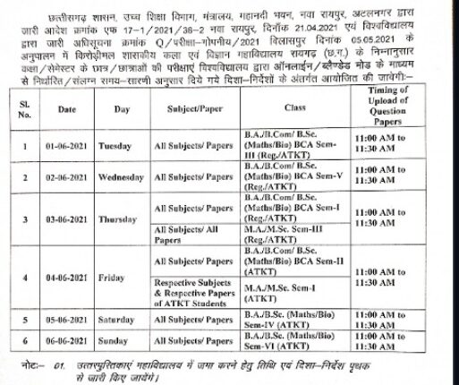 किरोड़ीमल शासकीय कला एवं विज्ञान महाविद्यालय रायगढ़ के लिए भी परीक्षा की समय सारिणी जारी कर दी गयी है। 1 जून से 6 जून तक संचालित होने वाली परीक्षा के लिए प्रश्न पत्र 11 बजे से 11.30 बजे तक अपलोड कर दिया जायेगा।