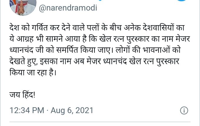 पीएम मोदी ने ट्वीट में लिखा, ‘देश को गर्वित कर देने वाले पलों के बीच अनेक देशवासियों का ये आग्रह भी सामने आया है कि खेल रत्न पुरस्कार का नाम मेजर ध्यानचंद जी को समर्पित किया जाए. लोगों की भावनाओं को देखते हुए, इसका नाम अब मेजर ध्यानचंद खेल रत्न पुरस्कार किया जा रहा है.’