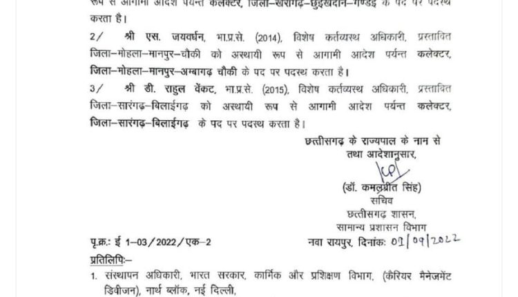 श्री एस. जयवर्धन को मोहला- मानपुर- अम्बागढ़ चौकी और श्री डी.राहुल वेंकट को सारंगढ़ -बिलाईगढ़ जिले की ज़िम्मेदारी दी गई।