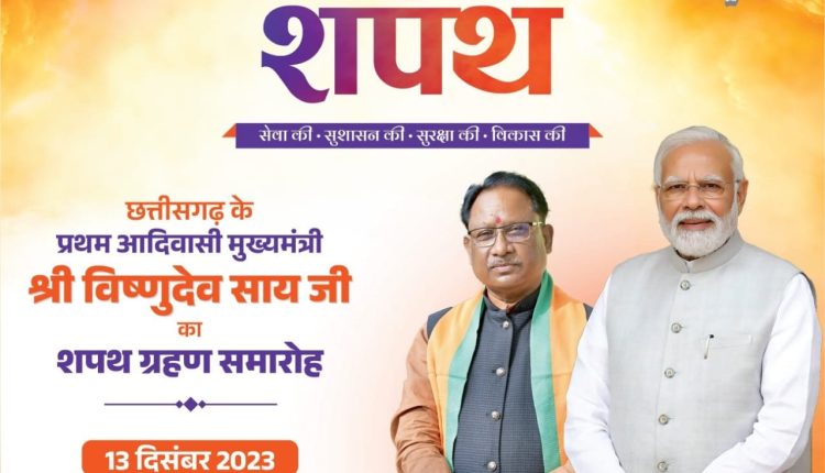रायपुर— 13 दिसम्बर 2023 छत्तीसगढ़ में मुख्यमंत्री के चेहरे से पर्दा हटने के बाद अब मंत्रिमंडल के गठन का बेसब्री से इंतजार किया जा रहा है। प्रदेश में भाजपा ने आदिवासी चेहरे विष्णुदेव साय को मुख्यमंत्री के रूप में चयनित किया है। आज राजधानी रायपुर के साइंस कालेज मैदान में दोपहर दो बजे शपथ ग्रहण समारोह है, जिसमें प्रधानमंत्री नरेन्द्र मोदी मुख्य अतिथि होंगे। शपथ ग्रहण में मुख्यमंत्री के साथ दो उप मुख्यमंत्री व 10 मंत्री भी शपथ ले सकते हैं। शपथ ग्रहण समारोह में केंद्रीय गृह मंत्री अमित शाह, भाजपा के राष्ट्रीय अध्यक्ष जेपी नड्डा, केंद्रीय मंत्री डा. मनसुख मांडविया, छत्तीसगढ़ प्रदेश प्रभारी ओम माथुर, सह प्रभारी नितिन नबीन समेत दूसरे राज्यों के कुछ मुख्यमंत्री भी शामिल होंगे।