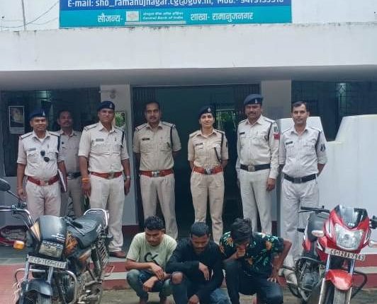एसडीओपी प्रेमनगर प्रकाश सोनी के मार्गदर्शन में चोर की पतासाजी की जा रही थी इसी बीच मुखबीर से सूचना मिला कि ग्राम दवना का कमलभान सिंह लोहे का बाट रखा और बिक्री करने के लिए ग्राहक की तलाश कर रहा है। सूचना पर थाना रामानुजनगर पुलिस ने त्वरित कार्यवाही करते हुए दबिश देकर कमलभान सिंह पिता शिव सिंह उम्र 25 वर्ष को पकड़ा। पूछताछ पर उसने बताया कि अपने साथी राहुल द्धिवेदी एवं अशोक सिंह के साथ 2 मोटर सायकल से अदानी रेलवे साइडिंग चेक पोस्ट पहुंचे और 2 नग लोहे का बाट चोरी करना स्वीकार किया। मामले में संलिप्त आरोपी राहुल द्धिवेदी पिता आदित्य उम्र 25 वर्ष निवासी रामानुजनगर व अशोक सिंह पिता जवाहर लाल उम्र 22 वर्ष ग्राम सरईपारा, थाना रामानुजनगर को भी घेराबंदी कर पकड़ा गया। आरोपियों के निशानदेही पर 50-50 किलो का लोहे का बाट कीमत करीब 10 हजार रूपये एवं घटना में प्रयुक्त 2 नग मोटर सायकल जप्त कर तीनों आरोपियों को गिरफ्तार किया गया। इस कार्यवाही में थाना प्रभारी रामानुजनगर रूपेश कुंतल, प्रशिक्षु डीएसपी दीपमाला कुर्रे, एएसआई बिसुनदेव पैंकरा व प्रधान आरक्षक हंसराम कनेडिया सक्रिय रहे।