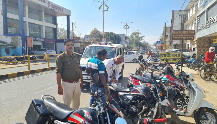 सूरजपुर। हाइवे और शहर के मुख्य मार्ग पर वाहन खड़े करने के मामले में ट्रैफिक पुलिस ने कार्रवाई की है। पुलिस अधीक्षक सूरजपुर श्री रामकृष्ण साहू (भा.पु.से.) ने नगर में सुगम यातायात व्यवस्था बनाए रखने के निर्देश यातायात प्रभारी को दिए है। इसी क्रम में यातायात पुलिस ने बैंकों के सामने लापरवाही पूर्वक सड़क पर वाहन खड़ा करने वाले 4 वाहन चालकों के विरूद्ध मोटर व्हीकल एक्ट के तहत कार्यवाही किया है। पुलिस यह कार्रवाई सड़क दुर्घटनाएं रोकने एवं सुगम यातायात बनाने के लिए कर रही हैं।