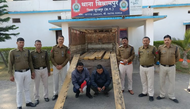 मामले की सूचना पर पुलिस अधीक्षक श्री रामकृष्ण साहू ने चोरों की गंभीरतापूर्वक पतासाजी कर जल्द गिरफ्तार करने के निर्देश थाना प्रभारी को दिए थे। अतिरिक्त पुलिस अधीक्षक मधुलिका सिंह व एसडीओपी सूरजपुर प्रकाश सोनी के मार्गदर्शन में थाना विश्रामपुर पुलिस चोर की पतासाजी में लगी थी, इसी बीच थाना प्रभारी को मुखबीर से सूचना मिली कि गांगीकोट रोड़ एसईसीएल नर्सरी में एक पिकअप वाहन संदिग्ध अवस्था में खड़ा है जिसमें लोहे का प्लेट लोड़ है। सूचना पर त्वरित कार्यवाही करते हुए घेराबंदी कर पिकअप वाहन क्रमांक सीजी 29 ए 3902 जिसमें संजय विश्वकर्मा पिता स्व. बंशीलाल उम्र 39 वर्ष निवासी पुराना बाजारपारा सूरजपुर व करमजीत सिंह उर्फ करमू पिता स्व. अमर सिंह उम्र 49 वर्ष निवासी विश्रामपुर को पकड़ा गया। पिकअप की तलाशी लेने पर उसमें 24 नग ग्रेडर मशीन का कटिंग एज कीमत 12 लाख रूपये का पाया गया। पूछताछ पर दोनों के द्वारा एक्सीवेशन वर्कशॉप विश्रामपुर से चोरी करना स्वीकार किया। मामले में 24 नग ग्रेडर मशीन का कटिंग एज व पिकअप वाहन को जप्त कर दोनों को गिरफ्तार किया गया। इस कार्यवाही में थाना प्रभारी विश्रामपुर के.डी.बनर्जी, एएसआई सोहन सिंह, प्रधान आरक्षक इन्द्रजीत सिंह, आरक्षक मुकेश साहू व अपील चौधरी सक्रिय रहे।