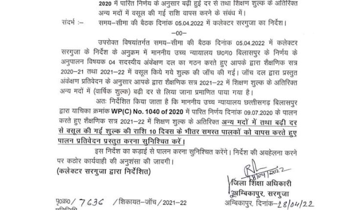 लंबे समय से उच्च न्यायालय के आदेश की अवहेलना करते हुए शहर के नामी स्कूल होली क्रॉस कान्वेंट स्कूल, ओरिएंटल पब्लिक स्कूल, कारमेल कान्वेंट स्कूल, मोंट फोर्ट स्कूल द्वारा निर्धारित शुल्क से ज्यादा की वसूली अभिभावकों से की जा रही थी। इस संबंध में जिला शिक्षा अधिकारी ने निर्देश जारी किए हैं। पढ़ें आदेश