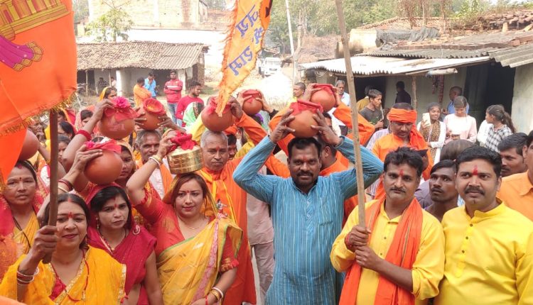 श्री राम जन्मभूमि तीर्थ क्षेत्र अयोध्या से आए पवित्र पूजित अक्षत कलश यात्रा का करंजी में भभ्य स्वागत राम भक्तों द्वारा