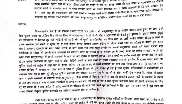 IRN.24…कांकेर सांसद भोजराज नाग के द्वारा भानुप्रतापपुर के ईमानदार पुलिस कर्मियों के खिलाफ अभद्र भाषा का प्रयोग करने व उनके समर्थकों द्वारा थाने के अंदर पुलिस वालों को लाईन से खड़े कर झापड़ मारने की बात कहने व घटनाक्रम का वीडियो वायरल करने व शासकीय कार्य मे बाधा उत्पन्न करने पर सांसद भोजराज नाग व उनके समर्थकों के खिलाफ थाना में आवेदन देने के 1 माह बाद भी एफआईआर दर्ज नही करने व समस्त छत्तीसगढ़ पुलिस कर्मचारियों के सम्मान तथा शहीद जवानों के सम्मान हेतु दिनांक 27/03/2025 दिन गुरुवार को थाना भानुप्रतापपुर का “सँयुक्त पुलिस कर्मचारी एवं परिवार कल्याण संघ” द्वारा अनिश्चित कालीन घेराव करने की सूचना दी है।मामला यह है कि दिनांक 09/02/2025 दिन रविवार को भानुप्रतापपुर में साप्ताहिक बाजार लगा हुआ था तथा उसी दिन चुनाव प्रचार का अंतिम दिन भी था जिस से भानुप्रतापपुर में लोगों की भीड़ व सुविधाओं को देखते हुए पुलिस के द्वारा अपनी ड्यूटी को ईमानदारी से निभाते हुए बड़ी गाड़ियों को शहरी क्षेत्र में घुसने से प्रतिबंधित कर दिया गया था, तभी कांकेर सांसद भोजराज नाग व उनके समर्थक उस रास्ते से गुजर रहे थे उसी दौरान सांसद महोदय आचार संहिता के दौरान अपने आप को व्हीआईपी बताते हुए थाना प्रभारी रामेश्वर देशमुख के साथ अभद्र तरीके से बात करने लगे तथा थाना प्रभारी को जबरन वसुलीबाज कहने लगे थाना प्रभारी बड़ी शालीनता से सांसद को अपनी बात समझाने की कोशिश करते रहे लेकिन सांसद महोदय अपनी अभद्र भाषा का प्रयोग लगातार करते रहे तथा थाना भानुप्रतापपुर में अपने समर्थकों के साथ जा कर पुलिस के खिलाफ लगातार अभद्र शब्दों का प्रयोग करते हुए धमकी देते रहे उसी दौरान पुलिस अधिकारी के द्वारा थाने के अंदर वीडियो बनाने से मना करने पर सांसद भोजराज नाग के समर्थक के द्वारा बोला गया कि पुलिस वालों को लाईन से खड़ा कर के झापड़ मारूंगा तब उसे सांसद ने अपने कार्यकर्ता को मना नही किया तथा इस पूरे घटनाक्रम को शोसल मीडिया में वायरल कर दिया गया है जिस से पुलिस विभाग की छबि धूमिल हो रही है तथा पुलिस अधिकारियों व कर्मचारियों का मनोबल गिर रहा है तथा पूरे सँयुक्त पुलिस कर्मचारी एवं परिवार कल्याण संघ के सदस्यों के अंदर काफी रोष व्याप्त है, सांसद भोजराज नाग व उनके समर्थकों के खिलाफ थाना भानुप्रतापपुर जिला कांकेर में शिकायत करने के बाद भी भारतीय जनता पार्टी के सरकार के दबाव में अब तक भोजराज नाग व उनके समर्थकों के ऊपर एफआईआर दर्ज नही की गई है तथा पुलिस कर्मचारी आज भी अपने सम्मान के लिए दर दर भटक रहे हैं तथा बहोत से शहीद जवानों के परिजन भी आज तक अपने मूल अधिकारों के लिए अब तक भटक रहे हैं इन सभी को न्याय दिलाना सँयुक्त पुलिस कर्मचारी एवं परिवार कल्याण स