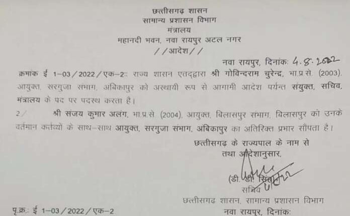 अम्बिकापुर 04 अगस्त 2022/छत्तीसगढ़ शासन सामान्य प्रशासन विभाग मंत्रालय द्वारा जारी आदेश के अनुसार श्री गोविन्दराम चुरेन्द्र भा,प्र, से(2003) आयुक्त सरगुजा संभाग अम्बिकापुर कको अस्थायी रूप से आगामी आदेश पर्यन्त, संयुक्त,सचिव मंत्रालय के पद पर पदस्थ करता है। उनके स्थान पर श्री संजय कुमार अलंग आयुक्त बिलासपुर संभाग के साथ साथ आयुक्त सरगुजा संभाग अम्बिकापुर का अतिरिक्त प्रभार सौंपता है।
