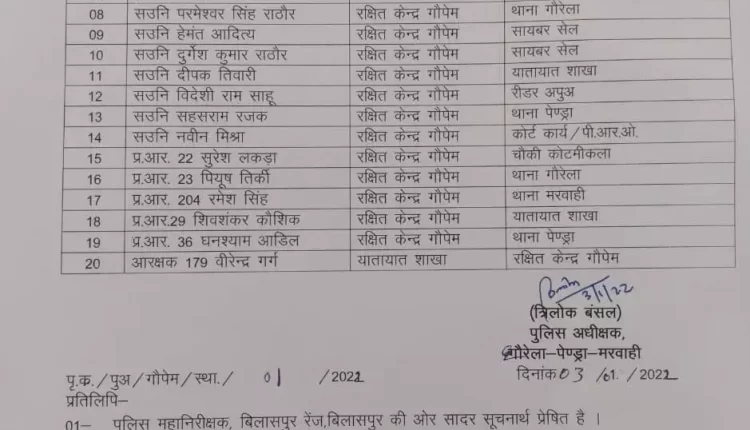 सब इंस्पेक्टर समेत 20 आरक्षकों का हुआ तबादला, एसपी ने जारी की सूची