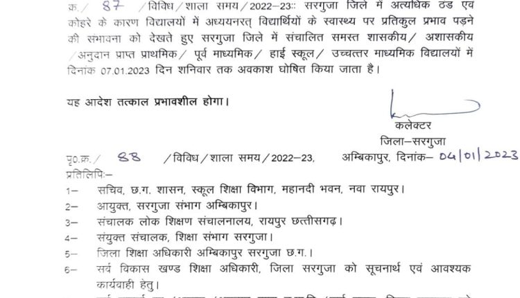 अंबिकापुर, राहुल शुक्ला: पिछले कुछ दिनों से सरगुजा में कड़ाके की ठंड का कहर जारी है। तड़के सुबह से लेकर रात तक कोहरे की धुंध बिखरी रहती है। इस ठंड को देखते हुए कलेक्टर सरगुजा द्वारा सभी विद्यालयों हेतु तीन दिवस का अवकाश जारी किया गया है। आगामी 7 जनवरी दिन शनिवार तक सभी स्कूलों को बंद रखने हेतु आदेशित किया गया है।