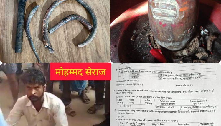 मुकेश कुमार,सूरजपुर: 27 अक्टूबर की सुबह 7:00 बजे के लगभग सुरजपुर जिले के ग्राम शिवनंदपुर में अवरदुगु निवासी मो. सेराज पिता मो. सगीर के द्वारा शिवनंदपुर के अवरदुगु के सार्वजनिक शिव मन्दिर के शिवलींग को खण्डित कर लोगो के धार्मिक भवनाओं को ठेस पहुंचाने का काम किया गया है। गांव वालों की शिकयत से नजदीकी थाना क्षेत्र में इसकी लिखित शिकायत दर्ज कराई गई है और सेराज आ मो सगीर को पुलिस हिरासत में ले लिया गया है