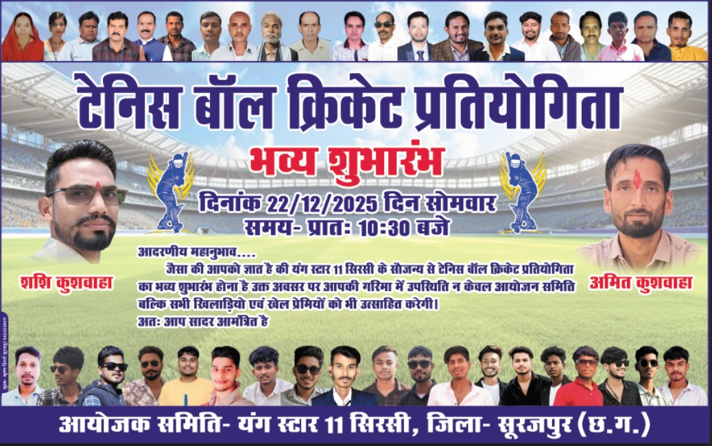 सूरजपुर भैयाथान सिरसी।खेल प्रतिभाओं को प्रोत्साहित करने और युवाओं में खेल भावना को मजबूत करने के उद्देश्य से ग्राम सिरसी में टेनिस बॉल क्रिकेट प्रतियोगिता का भव्य आयोजन किया जा रहा है।