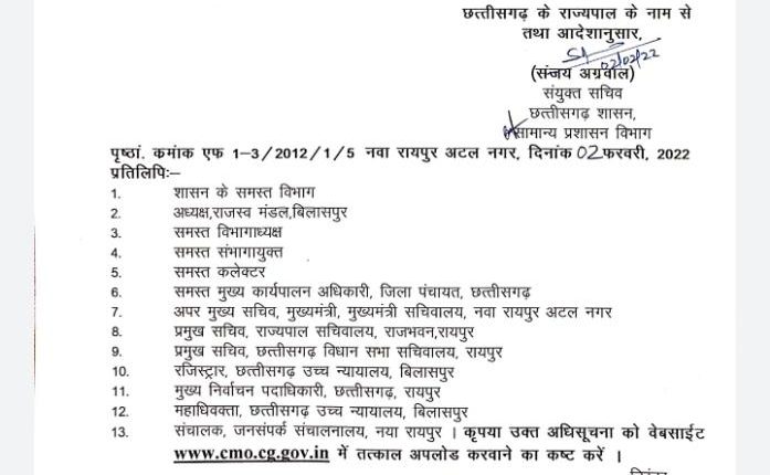 राज्य शासन द्वारा शासकीय कर्मचारियों की कार्यक्षमता और उत्पादकता बढ़ाने के उद्देश्य से माह के द्वितीय एवं तृतीय शनिवार की भांति सभी शनिवार को अवकाश घोषित किया जाता है। शासकीय कार्यालयों की कार्यअवधि के संबंध पूर्व में जारी आदेश को अधिक्रमित करते हुए राज्य के मंत्रालय एवं विभागाध्यक्ष कार्यालयों तथा समस्त मैदानी कार्यालयों हेतु कार्य अवधि सुबह 10:00 बजे से शाम 5:30 तक निर्धारित की जाती है। कार्यालय अवधि में भोजन अवकाश पूर्व की भांति ही रहेगा।