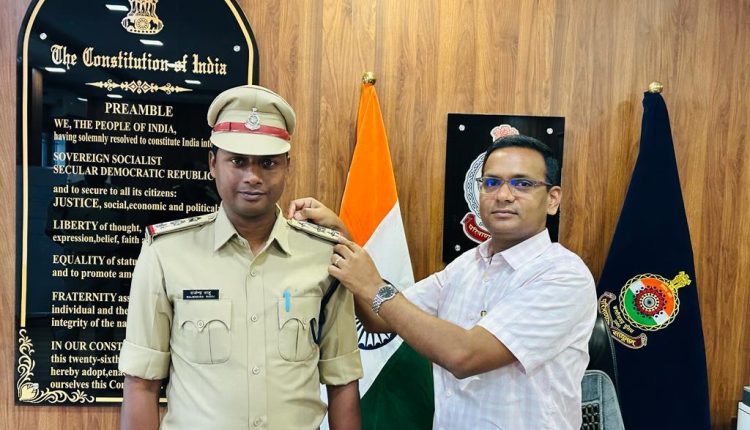 सूरजपुर जिले के एसआई राजेन्द्र साहू पदोन्नत होकर बने टीआई, पुलिस अधीक्षक ने स्टार लगाकर दी पदोन्नति।