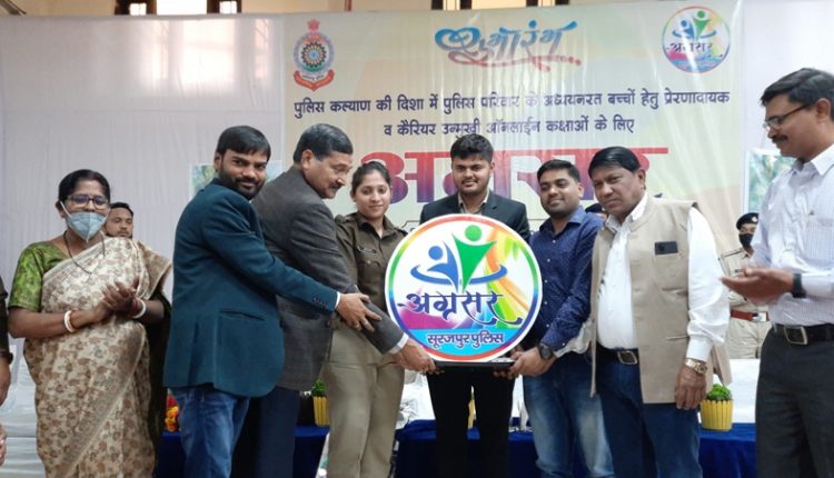 सूरजपुर। राज्य शासन, पुलिस महानिदेशक एवं पुलिस महानिरीक्षक सरगुजा रेंज के द्वारा पुलिस कल्याण की दिशा में कार्य करने के निर्देश प्राप्त हुए थे इसी परिपेक्ष्य में सूरजपुर जिले के पुलिस परिवार के अध्ययनरत् बच्चों को प्रेरणादायक व कैरियर उन्मुखी ऑनलाईन कक्षाओं के लिए आईजी सरगुजा रेंज श्री अजय यादव के मार्गदर्शन में अग्रसर कार्यक्रम का शुभारंभ रविवार, 14 अगस्त 2021 बाल दिवस के अवसर पुलिस अधीक्षक श्रीमती भावना गुप्ता, सीईओ जिला पंचायत श्री राहुल देव, प्रशिक्षु आईपीएस श्री उमेश गुप्ता, जिला कांग्रेस अध्यक्ष श्रीमती भगवती राजवाड़े, नगर पालिका अध्यक्ष श्री के.के.अग्रवाल के द्वारा किया गया जिसका पुलिस परिवार के बच्चों में खासा उत्साह देखा गया। सुपर-30 संस्थापक श्री आनंद कुमार ने बच्चों को शिक्षा, लक्ष्य हासिल करने को लेकर बच्चों को ज्ञानवर्धक जानकारियां देते हुए शिक्षा के प्रति मोटिवेट किया। मोटिवेशन स्पीकर विनोद कश्यप के द्वारा बच्चों को कई शिक्षा से जुड़ी जानकारियां दी गई। कार्यक्रम में अग्रसर से जुड़े शासकीय व गैर शासकीय शिक्षकों को सम्मानित किया गया। सर्वप्रथम स्वागत गीत उसु लाईन हायर सेकेण्डरी स्कूल बनखेता के बच्चों के द्वारा दी गई।