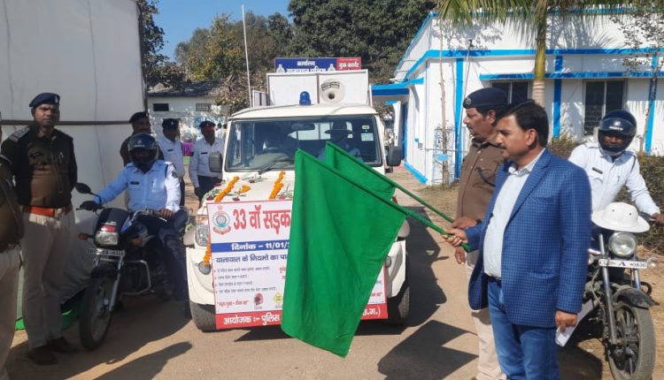 सूरजपुर। 33वां राष्ट्रीय सड़क सुरक्षा सप्ताह के तहत् आमजनों को यातायात नियमों के प्रति जागरूक करने, दो पहिया वाहन चालकों को अनिवार्य रूप से हेलमेट पहनने हेतु प्रेरित करने, दुर्घटना से बचाव के उपाय से लोगों को अवगत कराने, यातायात नियमों की जानकारी सहित यातायात संबंधी विविध आयोजन सड़क सुरक्षा सप्ताह के दौरान सूरजपुर पुलिस के द्वारा की जाएगी। सूरजपुर में 33वां राष्ट्रीय सड़क सुरक्षा सप्ताह का शुभारंभ बुधवार, 11 जनवरी 2023 को पुलिस अधीक्षक सूरजपुर श्री रामकृष्ण साहू (भा.पु.से.) के द्वारा किया गया।