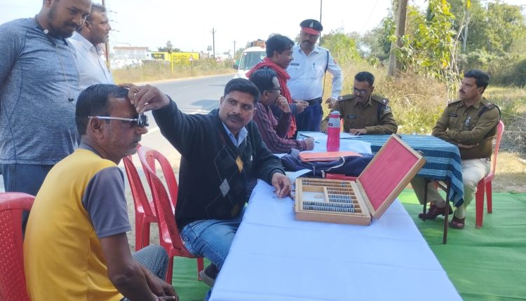 शुक्रवार, 18 नवम्बर को यातायात प्रभारी बृजकिशोर पाण्डेय के द्वारा जिला परिवहन अधिकारी अमित कश्यप की मौजूदगी में नेशनल हाईवे पर ग्राम सतपता में वाहन चालकों का नेत्र जांच शिविर का आयोजन किया। नेत्र चिकित्सक डॉ. प्रदीप कुजूर ने वाहन 110 वाहन चालको की आंखों का परीक्षण किया गया जिनमें 65 चालकों के नेत्र सही पाए गए, 43 वाहन चालकों को चश्मे की आवश्यता होने पर उन्हें चश्मा पहनने एवं 2 चालकों के आंखों में मोतियाबिंद की समस्या पाए जाने पर जल्द ऑपरेशन करने की सलाह दी गई। यातायात प्रभारी ने बताया कि इस कैंप का मुख्य उद्देश्य बस, ट्रक व छोटे 4 पहिया वाहन के चालकों की आंखों की जांच कराना है। वाहन चालकों के नेत्र सही रहेंगे तो सफर के दौरान सड़क पर दुर्घटनाएं कम होगी और लोग सुरक्षित रहेंगे। इस दौरान टेक्नेशियन श्यामलाल चौधरी, यातायात पुलिस के अधिकारी-कर्मचारी मौजूद रहे।