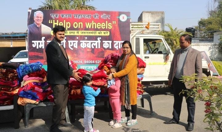 सूरजपुर-मोहिबुल हसन(लोलो)……. प्रदेश सहित जिले में कड़ाके की बढ़ती ठंड एवं शीतलहर के प्रकोप को देखते हुए जिला प्रशासन द्वारा हेल्प ऑन व्हील वाहन एक कदम सहायता की ओर चालू किया है। कलेक्टर ने जरूरतमंदो की सहायता एवं मदद करने हेल्प ऑन व्हील के माध्यम से लोगों को अधिक से अधिक सहायता करने के लिए कम्बल दान करने अपील की है। इसमें लोगों का सहायोग मिलना शुरू हो गया है। इसी कड़ी में कलेक्टर डॉ. गौरव कुमार सिंह की पत्नी डॉ. सुनीता सिंह ने अपनी दोनो बेटियों कु. आद्या एवं कु. अक्षरा के साथ अपने निवास पर 51 नग कम्बल प्रदान किया। इस दौरान जिला प्रशासन की ओर से जिला पंचायत सीईओ श्री राहुल देव ने कम्बल प्राप्त कर हेल्प ऑन व्हील के सदस्यों को सौंपा। कलेक्टर के निर्देश पर निर्धन परिवारों को ठंड से सुरक्षा प्रदान करने कंबल दान हेतु संस्थाओं और संगठनों को प्रेरित किया जा रहा है। हेल्प ऑन व्हील की इस पहल से जुड़कर वालंटियर्स सड़कों, गली, मोहल्लों में देर रात तक घूम-घूमकर जरूरतमंद लोगों को कंबल प्रदान कर रहे हैं। शीतलहर से पूरे छत्तीसगढ़ में कड़ाके की ठंड पड़ रही है, इसे देखते हुए जिले में नगर पालिका द्वारा पुराना बस स्टैंड, नया बस स्टैण्ड, जिला हास्पिटल में ठंड से बचाव के लिए अलाव भी जलाए जा रहे है।