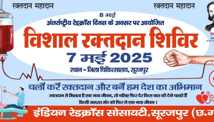 सूरजपुर/(IRN.24…) अंतरराष्ट्रीय रेडक्रॉस दिवस के उपलक्ष्य में 7 मई को विशाल रक्तदान शिविर का आयोजन किया जाएगा। शिविर का आयोजन जिला चिकित्सालय सूरजपुर में रक्तदान शिविर का आयोजन किया जाएगा। जिससे पीड़ित मानवता की सेवा के लिए रेडक्रॉस सोसायटी महत्वपूर्ण भूमिका निभा रही है। इसके लिए समाज के सभी नागरिकों को स्वेच्छा से आगे आकर सहयोग करना चाहिए ताकि जरूरतमंदों की सहायता की जा सके। शिविर में अधिक से अधिक संख्या में पहुंचकर सामाजिक परोपकार करते हुए रक्तदान कर पुण्य कमाएं।
