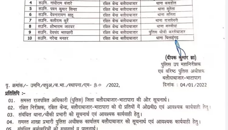बलौदाबाजार. पुलिस विभाग में एक बार फिर से तबादला आदेश जारी किया है. लंबे समय से रक्षित केंद्र में पदस्थ 10 सहायक उपनिरीक्षकों को थाने में पोस्टिंग दी गई है. एसएसपी दीपक कुमार झा ने तबादला आदेश जारी किया है. एसएसपी दीपक झा के द्वारा जारी आदेश के मुताबिक़ 10 सहायक उपनिरीक्षकों को थाना गिधपुरी, थाना भाठापारा ग्रामीण, पुलिस चौकी लवन, थाना कसडोल, थाना सोहेला, थाना सलिहा, थाना राजादेवरी, थाना सरसीवां, थाना बिलाईगढ़ और पुलिस चौकी करहीबाजार में पदस्थ किया गया है.