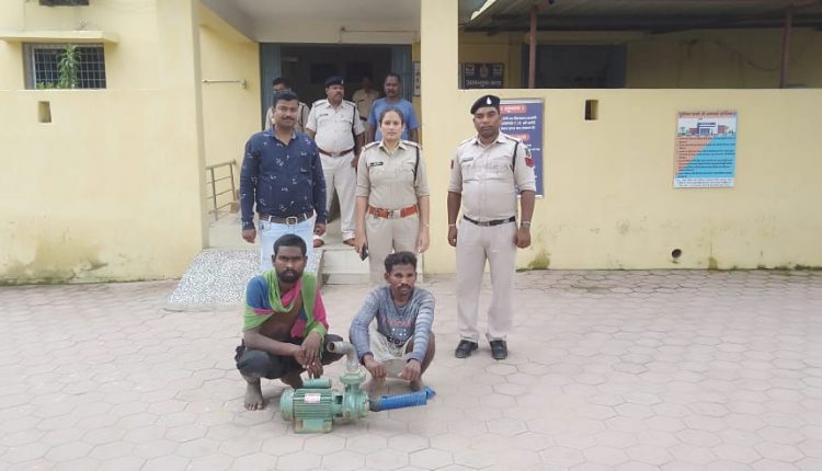 थाना सूरजपुर की पुलिस अज्ञात चोर की पतासाजी में लगी थी इसी बीच संदेही जगधारी सिंह पिता मोहन सिंह उम्र 28 वर्ष ग्राम बेलटिकरी को पकड़ा गया, पूछताछ पर उसने बताया कि अपने साढू रामअवतार के साथ मिलकर टूल्लू पम्प चोरी करना स्वीकार किया जिसके बाद पुलिस ने रामअवतार पिता स्व. मंगल साय उम्र 30 वर्ष निवासी अमगांव, थाना रामानुजनगर को घेराबंदी कर पकड़ा गया। आरोपियों के निशानदेही पर टूल्लू पम्प कीमत 15 हजार रूपये का जप्त कर दोनों आरोपियों को गिरफ्तार किया है। इस कार्यवाही में थाना प्रभारी सूरजपुर प्रकाश राठौर, प्रधान आरक्षक ऐसन पाल, आरक्षक दीपक दुबे, राजकुमार पासवान व सैनिक जहांगीर आलम सक्रिय रहे।