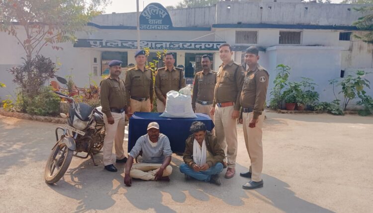सूरजपुर/IRN.24… डीआईजी व एसएसपी सूरजपुर प्रशांत कुमार ठाकुर ने अवैध कार्यो सहित नशे के कारोबार पर पूर्णतः अंकुश लगाते हुए सख्त कार्यवाही के निर्देश दिए है। इसी परिप्रेक्ष्य में दिनांक 11.01.2024 को थाना जयनगर पुलिस को मुखबीर से सूचना मिली कि 2 व्यक्ति मोटर सायकल में गांजा लेकर गुमगरा से हर्राटिकरा होते हुए विश्रामपुर की ओर जाने वाले है। सूचना पर पुलिस ने कार्यवाही करते हुए ग्राम कोरया में घेराबंदी कर मोटर सायकल सहित हरिशंकर पाण्डेय पिता ब्रम्हदेव पाण्डेय उम्र 32 वर्ष व देवकुमार साहू पिता अमृत प्रसाद साहू उम्र 44 वर्ष दोनों निवासी ग्राम गुमगरा, थाना लखनपुर, जिला सरगुजा को पकड़ा गया जिनके कब्जे से 8 किलो 30 ग्राम गांजा जप्त किया गया जिसकी बाजारू कीमत करीब 2 लाख 40 हजार रूपये है। मामले में गांजा व परिवहन में प्रयुक्त मोटर सायकल जप्त कर धारा 20(बी), 29 एनडीपीएस एक्ट के तहत कार्यवाही कर दोनों आरोपियों को गिरफ्तार किया गया। इस कार्यवाही में थाना प्रभारी जयनगर नरेन्द्र सिंह, एएसआई विशाल मिश्रा, प्रधान आरक्षक राजेन्दर एक्का, आरक्षक विकास मिश्रा, सोनू सिंह, सैनिक दीपक मूर्ति व नोहर राजवाड़े सक्रिय रहे।