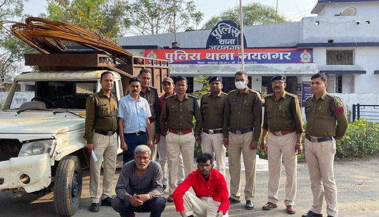 अतिरिक्त पुलिस अधीक्षक हरीश राठौर व सीएसपी जे.पी.भारतेन्दु के मार्गदर्शन में थाना जयनगर की पुलिस आरोपी की पतासाजी में लगी हुई थी इसी दौरान सोमवार को सूत्र से जानकारी मिला कि गणेशपुर निवासी गौरा उर्फ गौरांग वर्मन कुछ दिनों से रात्रि में 2-3 लोगों के साथ अपने पिकप वाहन में घुम-फिर रहा है जिसके बाद पुलिस ने संदेही गौरा उर्फ गौरांग को हिरासत में लिया। पूछताछ पर उसने बताया कि अपने साथी रामबली राजवाड़े निवासी कनकपुर व 1 अन्य साथी के साथ मिलकर 24 फरवरी की रात्रि में निर्माणाधीन मकान के पास से छड़ को चोरी कर अपने पिकप वाहन में लोड़ कर रखना बताया, जिसके बाद आरोपी रामबली को हिरासत में लिया गया।