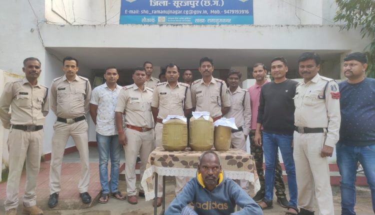 सूरजपुर। पुलिस अधीक्षक श्री रामकृष्ण साहू के निर्देश के बाद अवैध कारोबारियों के विरूद्ध पुलिस की निरंतर कार्यवाही जारी है। गुरूवार को थाना रामानुजनगर पुलिस को मुखबीर से सूचना मिली कि ग्राम सागरपुर निवासी नविन्दर सिंह बिक्री करने हेतु अवैध महुआ शराब रखा है। सूचना पर पुलिस टीम ने त्वरित कार्यवाही करते हुए एक आरोपी के कब्जे से 45 लीटर महुआ शराब जप्त किया है।