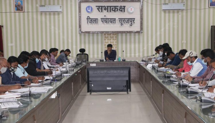 सूरजपुर -कलेक्टर के निर्देश पर जिला पंचायत सीईओ श्री राहुल देव ने जिले में मनरेगा अंतर्गत संचालित विकासात्मक एवं विभिन्न विभागों द्वारा किए जा रहे कार्यों की विकासखंड वार कार्यों के प्रगति की समीक्षा की। उन्होंने शासन की महत्वाकांक्षी योजना नरवा गरवा घुरवा बाड़ी अंतर्गत विकास कार्य किए जा रहे हैं उन्हें प्राथमिकता के साथ करते हुए निरंतर कार्य जारी रखने के निर्देश दिए हैं तथा प्रत्येक गौठानो में रोजगार की उपलब्धता बनी रहे उसके लिए निरंतर मल्टी एक्टिविटी के कार्य शत प्रतिशत करने के निर्देश दिए। उन्होंने सभी क्रियाशील गौठान में निर्माणाधीन शेड कार्य को पूर्ण करने, पानी की पर्याप्त उपलब्धता, लाइटिंग व्यवस्था आदि व्यवस्थित रखने के निर्देश दिए। सीईओ श्री राहुल देव ने गोबर खरीदी, गौठान में चरवाहा की व्यवस्था तथा सभी आजीविका की गतिविधि बेहतर करने निर्देशित किया है। प्रत्येक गौठान में लेमन ग्रास लगाने के निर्देश दिए।उन्होंने जल जीवन मिशन के अंतर्गत नल कनेक्शन के माध्यम सेघर घर पहुंचाए जा रहे उसका शत प्रतिशत क्रियानयन करने निर्देशित किया तथा 15 वा वित्त से बनाए जा रहे नल नल कनेक्शन के कार्य को पूर्ण करने तथा जल जीवन मिशन के अंतर्गत नल कनेक्शन कार्य में प्रगति लाकर निरंतर मॉनिटरिंग करने के निर्देश दिए। उन्होंने जर्जर पंचायत भवन को मरम्मत करने के निर्देश दिए।