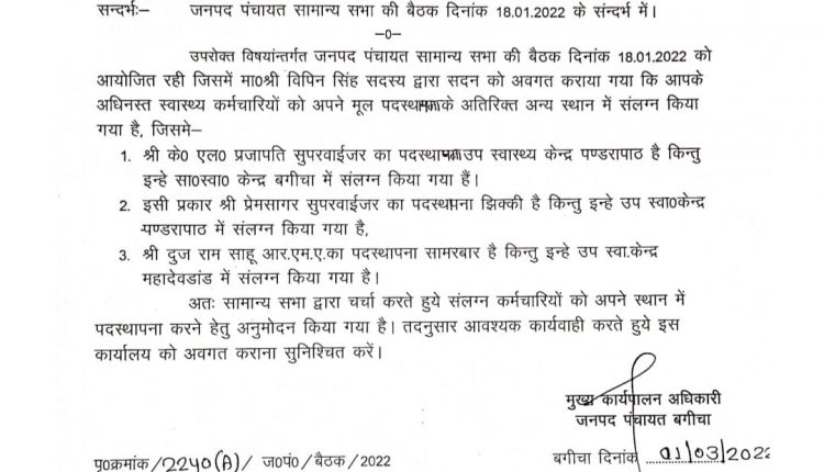 जनपद पंचायत बगीचा के जनपद सीईओ द्वारा 1 मार्च 2022 को जारी किए गए अनुमोदन पत्र में खण्ड चिकित्सा अधिकारी बगीचा को लिखा ग्या है कि के एल प्रजापति (सुपरवाइजर)प्रेम सागर (सुपरवाइजर)और आर एम ए दूजराम साहू को उनके मूल पद पर भेजा जाय ।इस मुद्दे पर जनपद के सामान्य सभा बैठक में जनपद सदस्य विपिन सिंह के द्वारा उठाये जाने के बाद वे समस्त जनपद सदस्यो से चर्चा करने के बाद इनकी वापसी का अनुमोदन किया गया है।